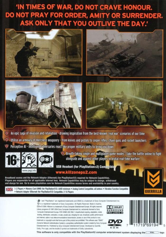 Set in the near future during a period of planetary colonization, Killzone drops you in the middle of a war between the ISA Command and a militaristic separatist faction, the Helghast. As one of four ISA members, your initial objective is to escort a high-ranking official to an evacuation point. You can experience several gameplay modes, including single-player, multiplayer (team-based and competitive), and online play for up to 12 players. Players can equip themselves with an armory of more than 27 different weapons based on modern technology.