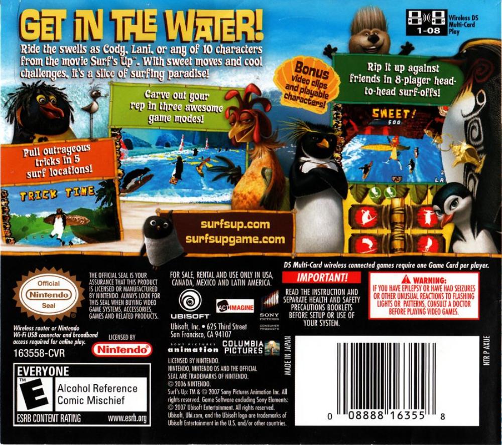 Surf's Up is an arcade surfing and extreme sports video game. The action is set at the annual "Reggie Belafonte Big Z Memorial Surf Off," where surfers from around the world are ready to risk it all for glory. Players experience the rush and thrills of surfing in exotic surf spots around Pen Gu Island and can rip it up and play as one of 10 characters from the film, including Cody, the young challenger from Shiverpool; Tank, the merciless champion; or Big Z, the surfing legend from the past. Only by mastering and understanding the waves can the player become not only the new champion, but a true surf legend. Game features include: Innovative arcade and surf feeling with players performing a variety of impressive tricks in the air and learning to surf inside a tube. Win the championship in the single-player mode or challenge your friends in the multiplayer mode with easy pick-up-and-play game controls. Surf in a variety of locations, each with its own waves and obstacles. Train in the calm water of Shiverpool, ride your first tubes in Pen Gu Island, and try to surf on the explosive waters of the volcano area.