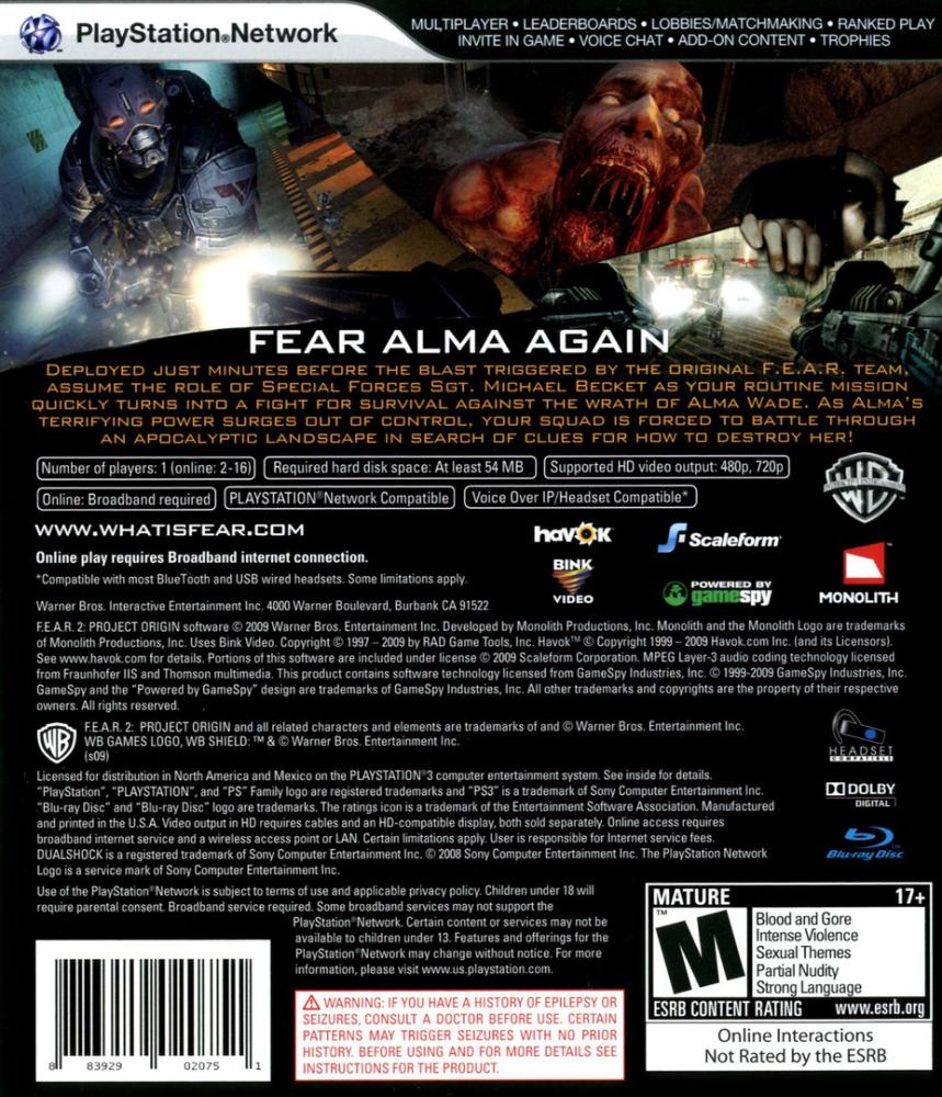 The sequel to F.E.A.R. continues the original game's spine-tingling supernatural suspense story of an escalating paranormal crisis that threatens to destroy a major American city. At the center of the calamity is the mysterious Alma, whose rage against those who wronged her triggered a chain of events that have spiraled completely out of control. Now that she has free reign, the consequences will be unimaginable.