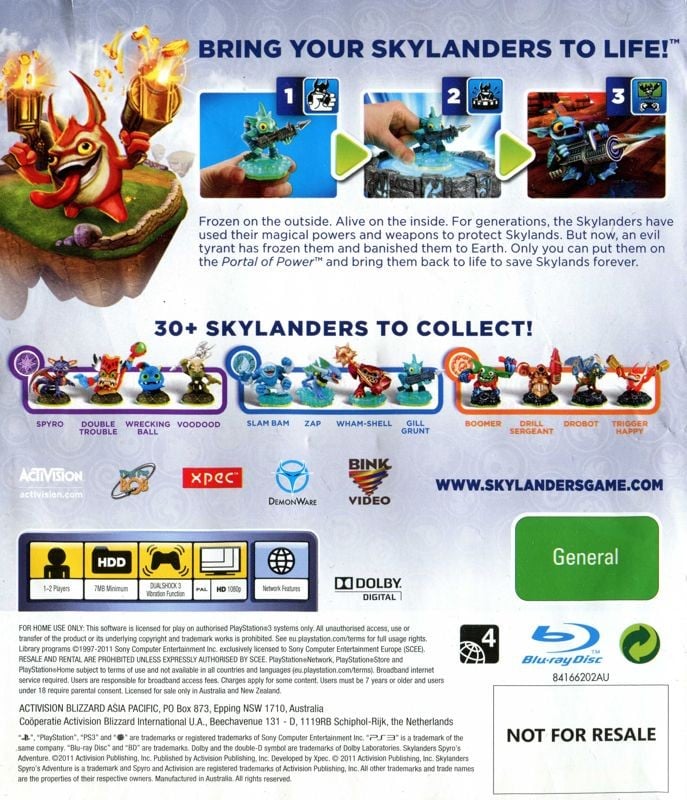 Skylanders Spyro's Adventure is an Action-Adventure game spin-off from the Spyro series designed for younger players that unlocks a whole new game universe while incorporating a unique gameplay mechanic utilizing more than 30 physical action figures that synch with consoles creating in-game character representations. The first release in the Skylander series, Skylanders Spyro's Adventure Starter Pack contains three action figures, an exclusive game peripheral as well as other items. Action figures are compatible with all versions of the game. The game features co-op and competitive multiplayer, mini-games and more.