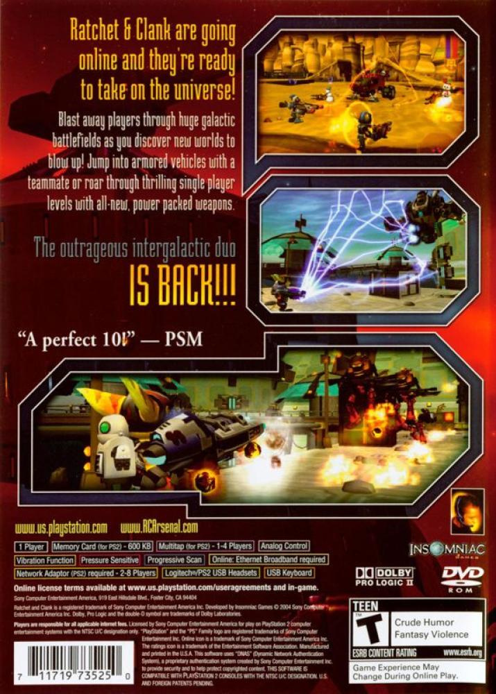 In Ratchet & Clank: Up Your Arsenal, Ratchet and Clank once again team up for an all-new adventure that combines diverse gameplay with elements of action, exploration, adventure, puzzle-solving, strategy, and role-playing into one experience. Together with the Q-Force, Ratchet and Clank set off to uncover the schemes of the sinister Dr. Nefarious and keep the galaxy safe for organic life. As one of three characters, you can now wield new weapons and gadgets, gain access to an array of vehicles, and master all-new abilities. The game also features both single-player and multiplayer (offline and online) gameplay.