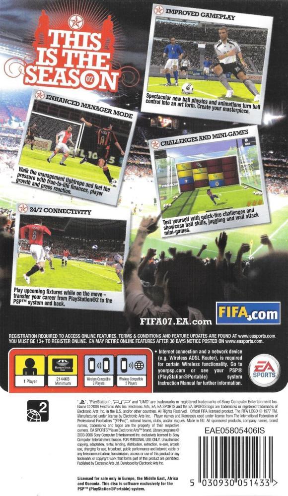 FIFA 07 delivers complete authenticity with licenses for all the world's top leagues, including MLS and Mexican 1st Division in North America, and 26 others from over 20 nations. This year, you have the power to shape your club's destiny in the EA Sports Interactive Leagues, a new online mode that enables you to pit your club against supporters of your real-world opponents. The online interactive leagues feature the F.A. Premier League, Bundesliga, French League and the Mexican 1st Division. Experience the future of online gaming as you play your games according to the real-world schedule. When they play, you play. Track your team's progress as the aggregate results determine your club's position in the league table. This year, new intelligent A.I. ensures that your 11 men on the pitch make realistic decisions, finding space and passing like professionals. A complete overhaul of the game engine now means that you have to employ real world tactics, make split-second decisions and think like a player in order to win matches. Watch as your players jostle and collide realistically while trying to win balls. Experience the realism of the world's superstars, who come to life with signature moves and authentic playing styles and a more sophisticated shooting mechanic that gives you greater control to produce finesse shots. Plus you now have the ability to apply topspin or backspin to the ball for more creative set-pieces.