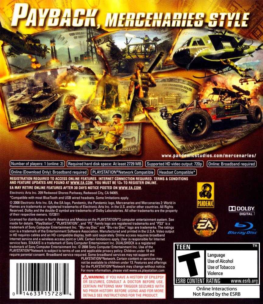 Mercenaries 2: World in Flames is an explosive open-world action game set in a massive, highly reactive, war-torn world. A power-hungry tyrant messes with Venezuela's oil supply, sparking an invasion that turns the country into a warzone. But for you, international crisis is all upside: You are a mercenary, and you profit from chaos. Mercenaries 2 features a slew of potential clients, all willing to pay you to do their dirty work. Dirty deeds, done for exorbitant fees. These are world powers with deep pockets, deep grudges, and enough arms and ammo to start World War III. This is your kind of environment. Mercenaries 2 features the latest and most dangerous in civilian and military tech, everything from shiny new sports cars, to the future-tech satellite-guided bunker-busting mini-nuke. Tanks, APCs, boats, luxury automobiles - you name it, you can have it delivered to you in real time. And if you run out of cash you can always 'acquire' the gear you need in the field. If you see it, you can buy it, steal it, or blow the living crap out of it. Play your own way, or play with the help of a friend in the new cooperative multiplayer mode. You are not a soldier. You don't have to play by anyone's rules. You have your own code: you will fulfill the terms of the contract, no matter what. Not everyone in the world of Mercenaries is as honorable. Everyone will try and screw you, given the chance. They think they can get away with it, because they don't know rule #1: EVERYBODY PAYS.