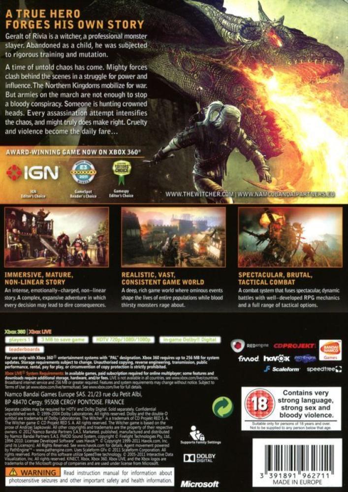 The second installment in the RPG saga about the Witcher, Geralt of Rivia, features a thoroughly engrossing, mature storyline defining new standards for thought-provoking, non-linear game narration. In addition to an epic story, the game features an original, brutal combat system that uniquely combines tactical elements with dynamic action. A new, modern game engine, responsible for beautiful visuals and sophisticated game mechanics puts players in the most lively and believable world ever created in an RPG game. A captivating story, dynamic combat system, beautiful graphics, and everything else that made the original Witcher such a great game are now executed in a much more advanced and sophisticated way.