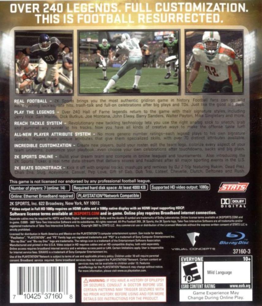 Draft your dream team from football's legendary players--over 240 of them. Choose your arena and pump up the fan base to create stadium energy you can feel. Next Gen Graphics feature thousands of new player animations--games come alive with sweat and steam, rabid fans in the stands and dynamic weather challenges.