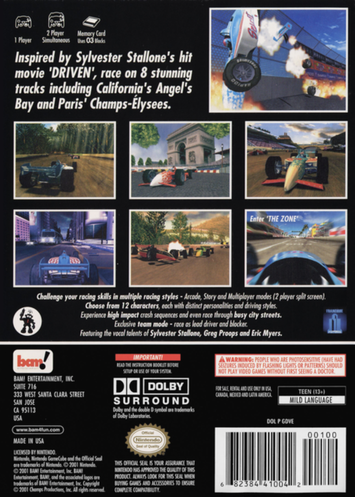 Players will immerse themselves in the dangerous, yet seductive world of open wheel racing. DRIVEN is based on Franchise Pictures and Warner Bros.' recently released film, DRIVEN, starring Sylvester Stallone. Surrounded by fast cars, fame, money, and women, drive as Jimmy Bly and Joe Tanto of Team Spirit. Pitted against their archrivals, Beau Brandenburg and Max Manley, gamers will fight for survival. Do you have what it takes to enter 'the zone' and then push on to the "ragged edge"? Will you grasp the victory from the others and take your place on the champion's podium?