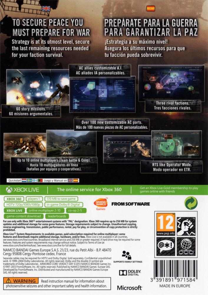 Renowned Japanese game developer FromSoftware returns to its hardcore mech action franchise with ARMORED CORE: VERDICT DAY. Command a squadron of advanced Armored Core mechs in a dystopian future ravaged by war and stripped of natural resources. Players will form squads of up to 20 members and enlist into one of the various in-game factions to wrestle control of territories away from other players in the game's persistent multiplayer mode. New gameplay features will be implemented into ARMORED CORE: VERDICT DAY to ensure that players who choose to play alone will be able to recruit a squad of A.I. controlled mechs and enjoy the robust feature sets of co-op and multiplayer modes, while new matchmaking system ensures that players will always find battles at a moment's notice.