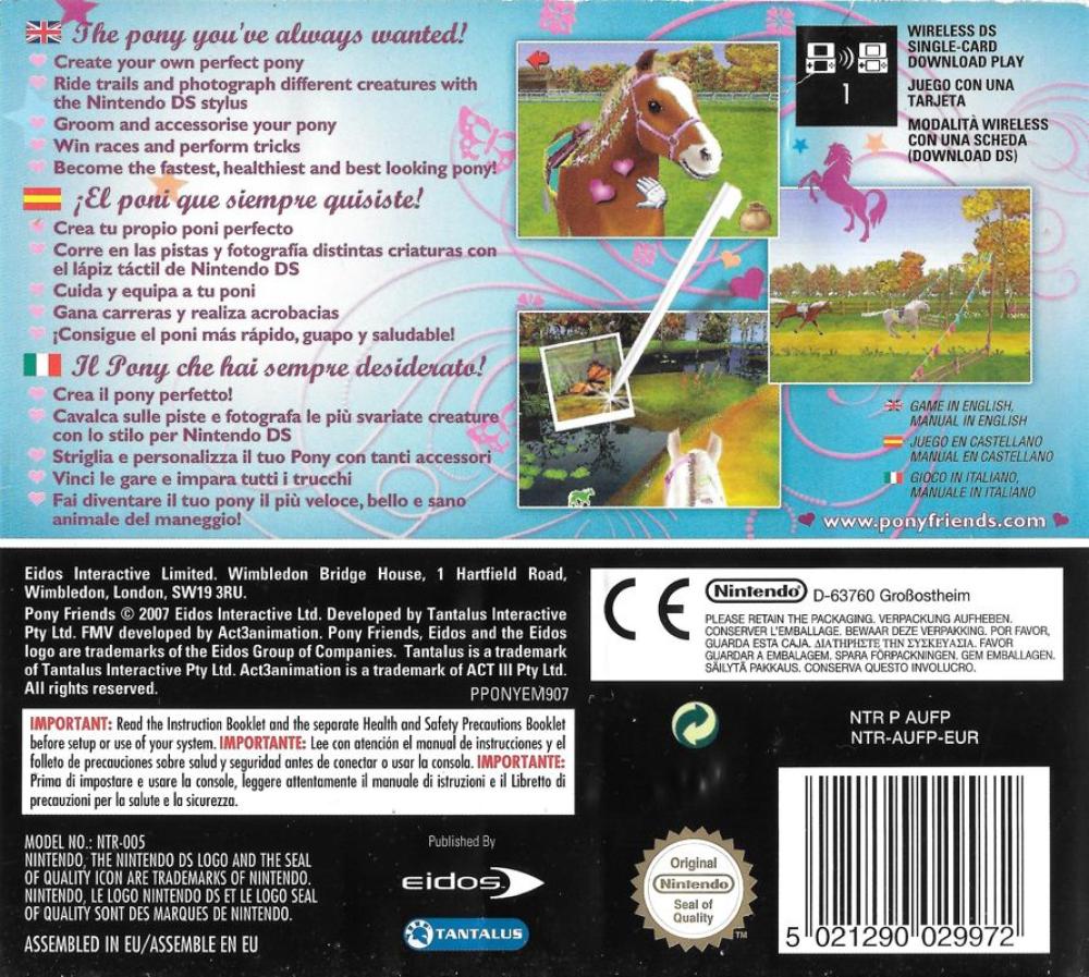 Pony Friends is a virtual pet game for the Nintendo DS where players get to emulate every cool aspect of owning their own pet pony. From grooming and accessorizing your pony with colorful custom gear to going on exciting trail rides where you encounter new wildlife friends, the world of Pony Friends offers a cool new interactive environment where kids learn how to care for their dream pony.