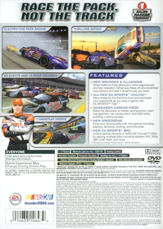The green flag has dropped with NASCAR Thunder 2004. From 200 MPH super-speedways to hairpin turns on 11 fantasy tracks, tuning your car and finding the line is no longer enough. Now you're running to the edge against 42 other unique NASCAR personalities every race, drivers who remember your every move and won't think twice about paying you back. Out-smart and out-drive them as you battle three-wide from green to checkers. Online or on your own, racing just became a contact sport.