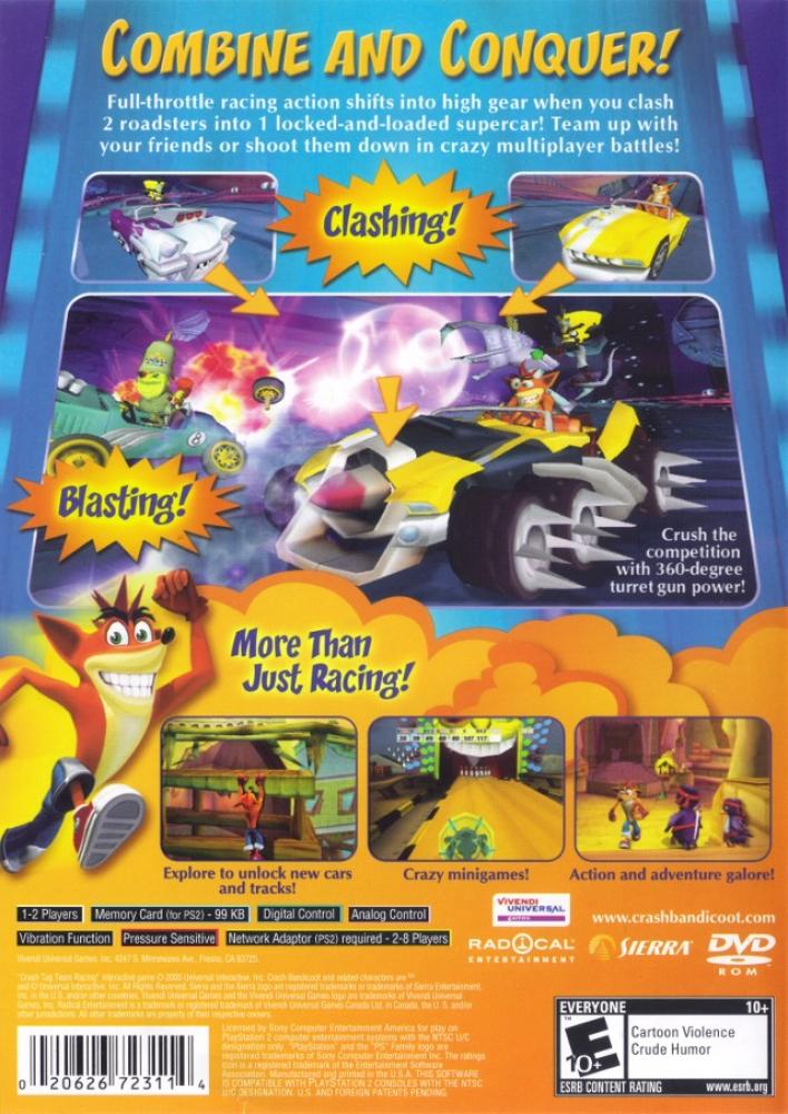 For the first time ever in a racing game, players will be able to fuse two cars together on the fly to form a super vehicle with the all-new "clashing" technology. In Crash Tag Team Racing, players can combine their car with an opponent's mid-race to make a super-car equipped with a powerful turret gun. When clashed, players can either get behind the wheel and drive or fire an onboard weapon. Each character has his or her own uniquely deadly 360˚ rotating turret. Players can continue the action out of the car where they can explore the entire world on foot and collect upgrades for their cars and unlock bonus tracks.