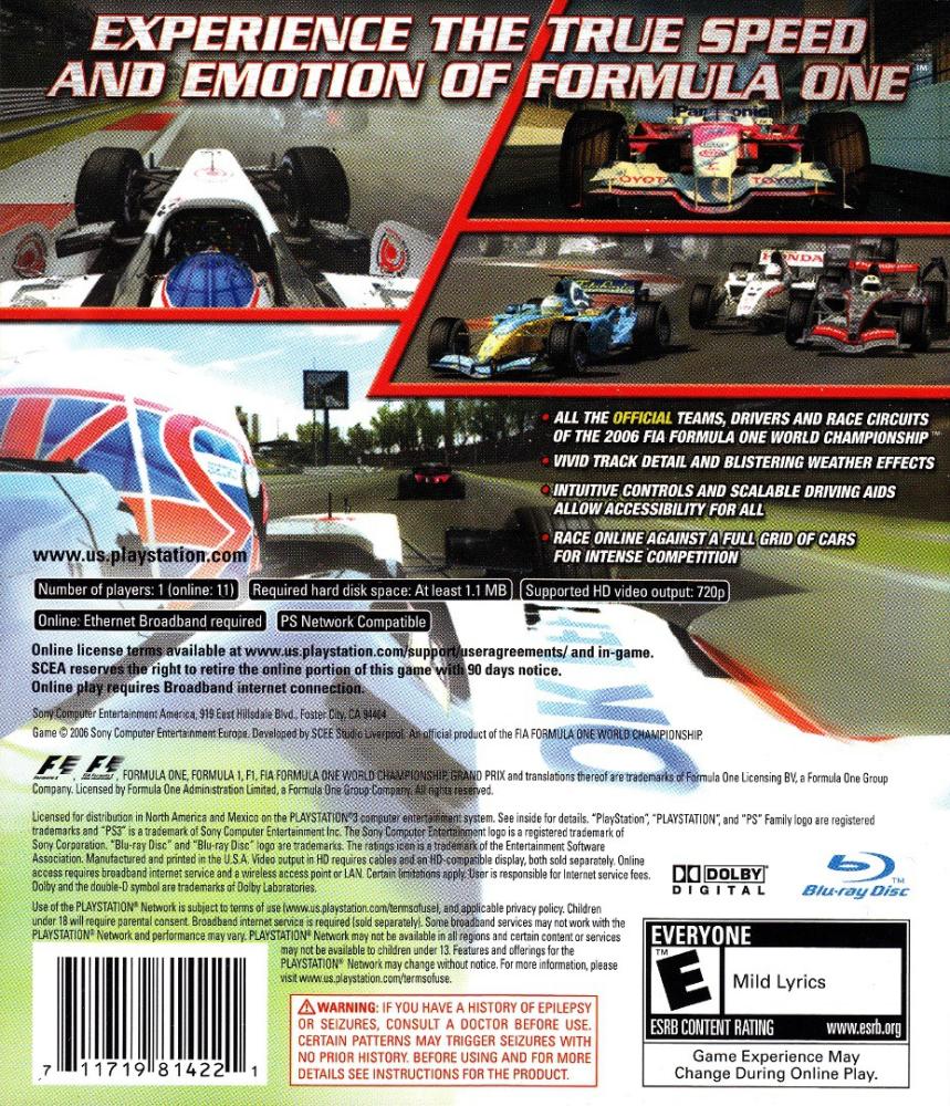 FORMULA ONE Championship Edition roars onto PS3 with all the official drivers, cars, circuits, rules and teams, including SCUDERIA TORRO ROSSO, SUPER AGURI F1 TEAM and MIDLAND F1 RACING in their debut year. Next Generation Experience - High definition visuals, full surround sound, extensive circuit details and lighting effects, progressive dirt and car damage make for a realistic racing experience.