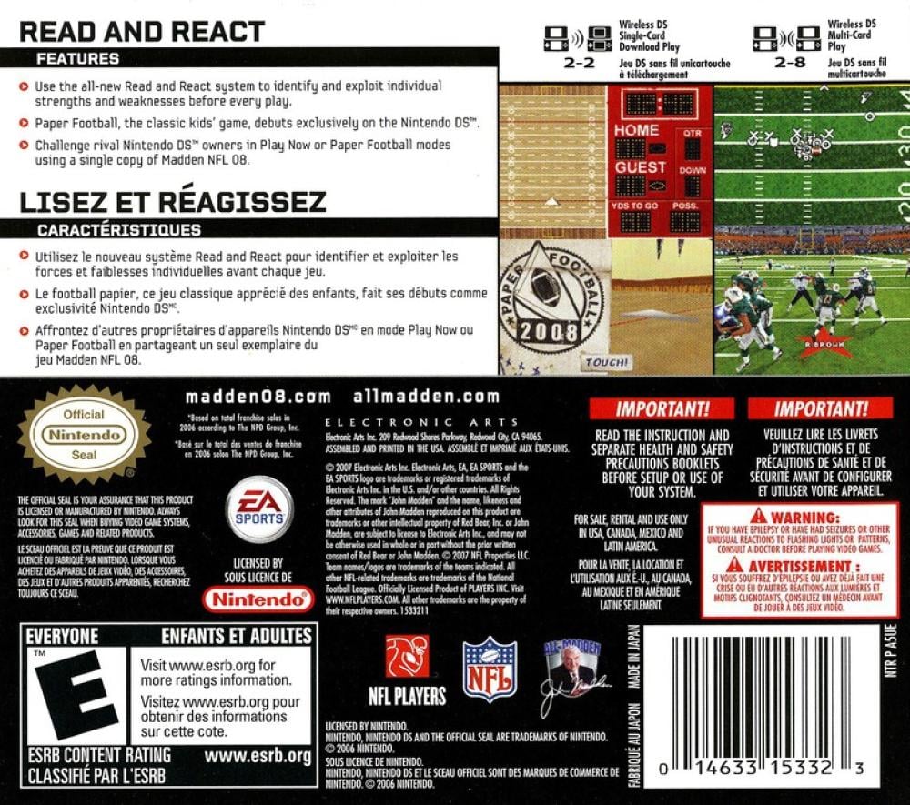 Feel what it's like to be a field general making key personnel decisions on both sides of the ball during the game's biggest moments in Madden NFL 08. Quickly identify your strongest players on the field before every snap then move them into position to make game-changing, momentum-altering plays. Play to your team's strengths by immediately reading your opponent's schemes and reacting to the action as soon as the ball is snapped.