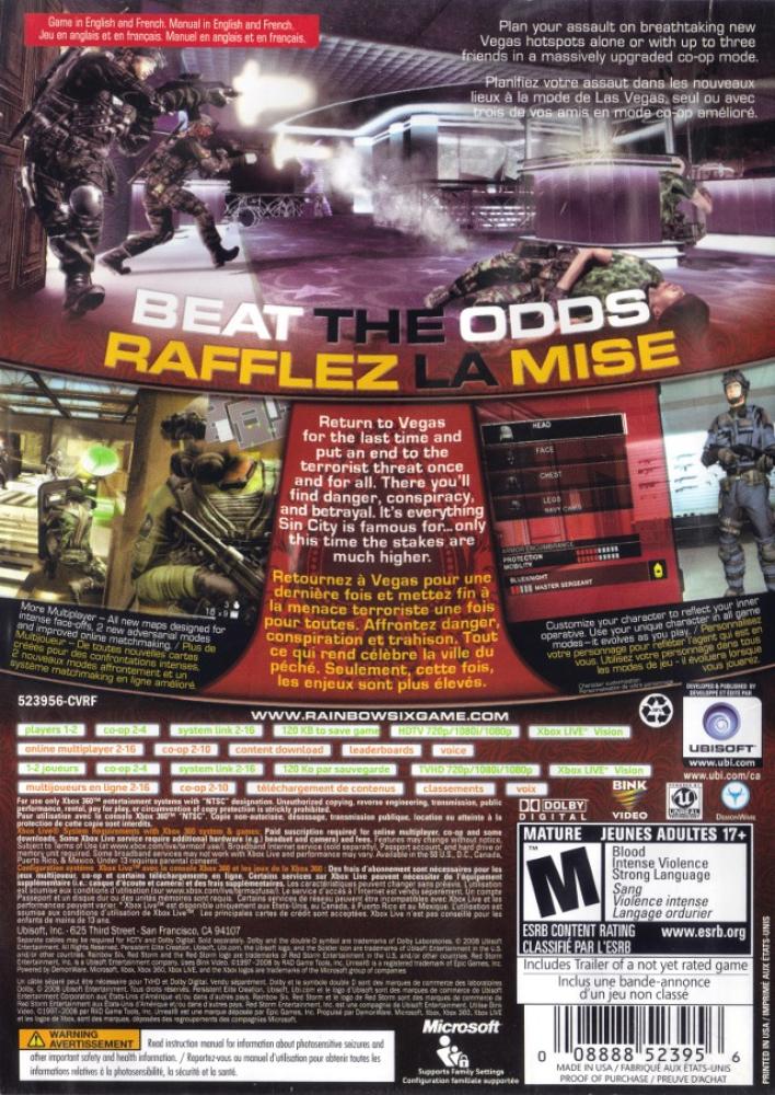 Tom Clancy's Rainbow Six Vegas 2 - the sequel to the award-winning next-generation first-person shooter - returns to Sin City. Tom Clancy's Rainbow Six Vegas 2 is your last chance to rescue America's sexiest city from an escalating terrorist siege that will force you into heart-pounding action from beginning to end. The best are back and this time winner takes all.