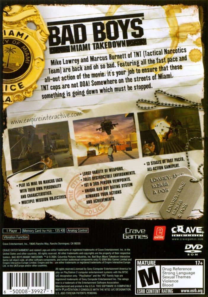Mike Lowrey and Marcus Burnett of the Tactical Narcotics Team are back to fight crime in Bad Boys II. Based on the movie, Bad Boys II follows this unlikely duo as they try to stop illegal drug trade in Miami. Through 15 action-packed stages, you'll play as either Mike or Marcus in first- or third-person viewpoints. Search for clues, wield a variety of weapons, and tear through fully destructible environments to complete a variety of mission objectives.