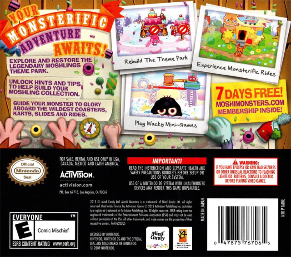 Moshi Monsters: Moshlings Theme Park, developed by Black Lantern Studios, invites players to restore the legendary Moshi theme park to its former glory. Players progressively unlock six zones by successfully building attractions and rescuing the scattered Moshlings (adorable, itty bitty pets for your pet monster). Users of the Nintendo 3DS can also interact with other Nintendo 3DS players via the StreetPass feature and play cool games to bring the Moshlings to life in a whole new dimension. Moshi Monsters: Moshlings Theme Park marks the first time fans can interact with beloved characters via 3D technology and introduces players to a brand new, exclusive Moshling that can transfer across platforms to the online world.