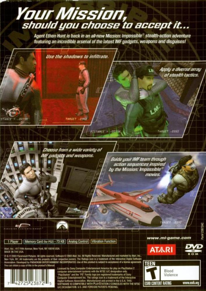 Your mission, should you choose to accept it, is to save the free world from certain doom. Ethan Hunt is back in Mission: Impossible Operation Surma, a stealth action adventure featuring an incredible arsenal of the latest weaponry, hi-tech gadgets, and mind-blowing disguises. Ethan and his IMF team travel to exotic international locations in an effort to thwart the Surma Corporation's diabolical plans for global domination. Throughout your mission, you'll be called upon to use your brains and brawn to get the job done.