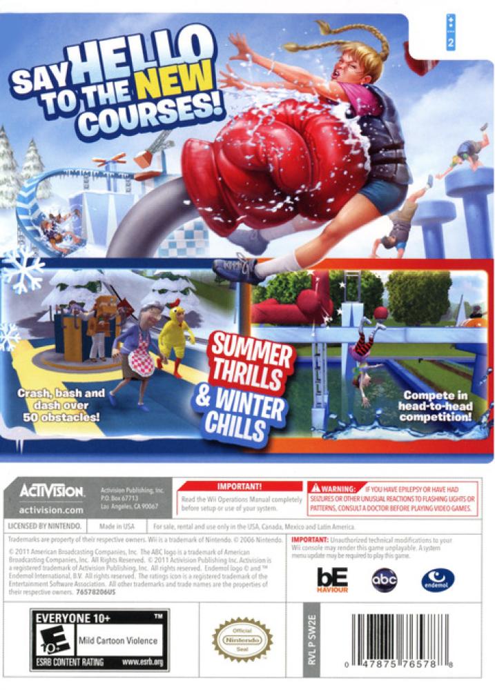Wipeout 2 will offer updated, outrageous course designs across all platforms with obstacles and effects taken straight from the show's summer and winter seasons. Players must navigate around snow, ice, foam, and fan-favorite obstacles like the Sucker Punch Wall and Big Balls; which are making their triumphant returns alongside more than 50 others. Extended gameplay on all systems encourages even more interaction and participation with family and friends. Once again, all the wild and crazy action is narrated by the show's hosts John Anderson and John Henson.