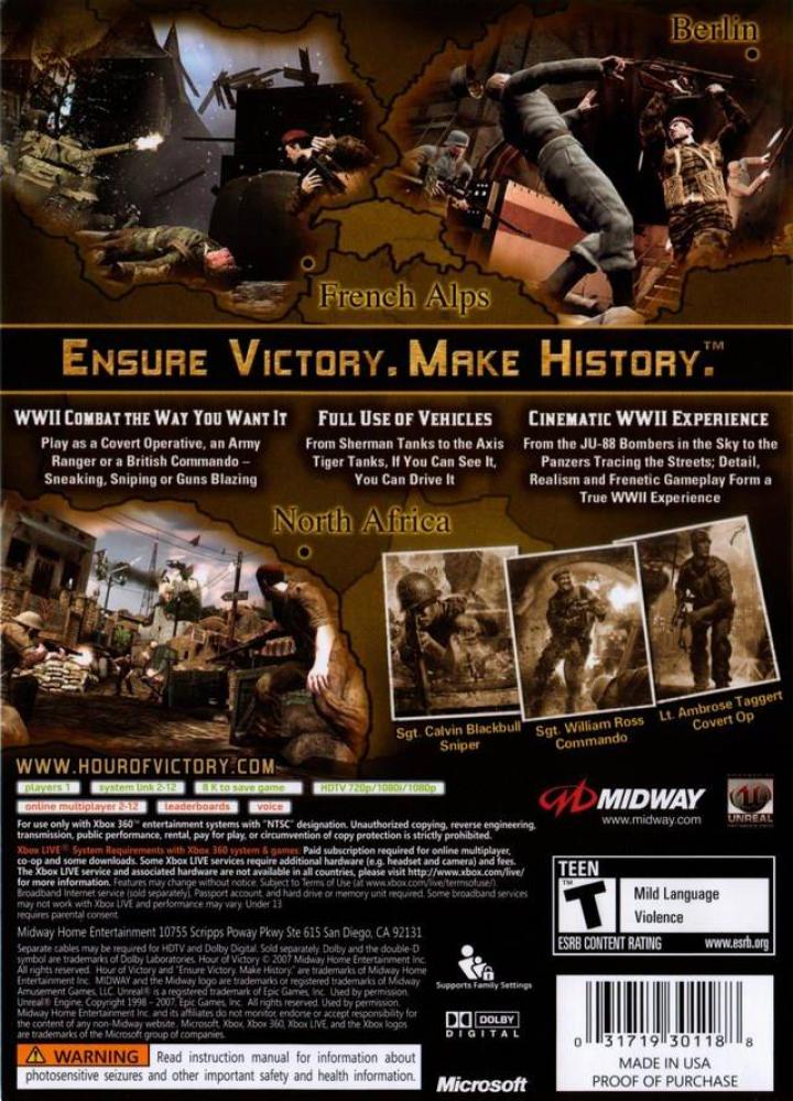 Hour of Victory allows you to play a key role in the pivotal and cinematic battles from the European and North African theaters of World War II, using the skills and gameplay style you choose. Sneak into enemy territory as a covert operative, storm the gates as a British Commando, or snipe from afar as an Army Ranger - each character's unique attributes will be needed for the fulfillment of the overall objective. Only with all these skills working closely together will you be able to say that you helped define the Hour of Victory.