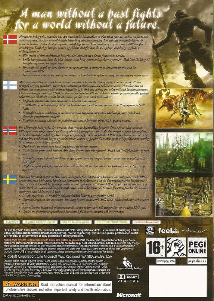 Lost Odyssey is the story of Kaim, an immortal character who has lived more than 1,000 years. He doesn't remember his past, and he doesn't know where his future lies. Throughout Kaim's journey, a handful of characters join him on an odyssey to discover their intricate past and destiny, leading players through a dramatic story of massive scale. Massively multiplayer online role-playing game elements are blended into the game's traditional role-playing game system, enabling players to make strategic decisions for a more immersive and deep gameplay experience. With story sequences penned by award-winning Japanese novelist Kiyoshi Shigematsu in cooperation with producer Hironobu Sakaguchi, Lost Odyssey sets a new benchmark for the RPG genre with a combination of true-to-life cinematics and an intriguing story of an immortal man. Players will witness Kaim's life as he lives through many generations, becomes part of numerous families, falls in and out of love, and confronts all of the conflicts that arise. Kaim's struggles are set in a world that is on the verge of a "mystical industrial revolution," where mankind has attained dark powers. The massively scoped worlds, memorable characters and epic storyline play as an intense and unsettling blockbuster action film. Heading up the artistic demands of the title is famed Japanese comic artist Takehiko Inoue. Renowned composer Nobuo Uematsu has been recruited to create a contemporary soundtrack.