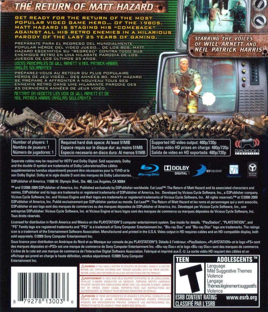 In Eat Lead: The Return of Matt Hazard, videogame action hero Matt Hazard gets his chance to prove once and for all that he is the king of shooters when the new owner of mega game publisher, Marathon Megasoft, gives Matt his comeback role starring in a new title for next-gen consoles that pits him against all of his memorable foes from videogames past. In the world of Eat Lead, however, everything stops being a game and becomes reality when it is clear that someone is using the new game to bring about Matt's death once and for all. With only the mysterious QA to help him, Matt must fight against a legion of Marathon Megasoft catalogue of videogame characters to keep it from being Game Over forever. Eat Lead pays homage to the games of yesteryear with a menagerie of classic enemies such as zombies, space marines, cowboys, genetically mutated super snipers, and more and an expansive level environment design that reflects videogame history in a next-gen package. The game fires on all cylinders with explosive artillery and combat moves to help gamers escape from a variety of predicaments including radically-changing environments during gameplay via hack effects Hazard's nemesis uses by altering the game's code on the fly. Throughout the adventure, players utilize a strategic cover system dubbed point and cover, upgradeable weapons and different interactive melee moves to attack and outsmart foes.