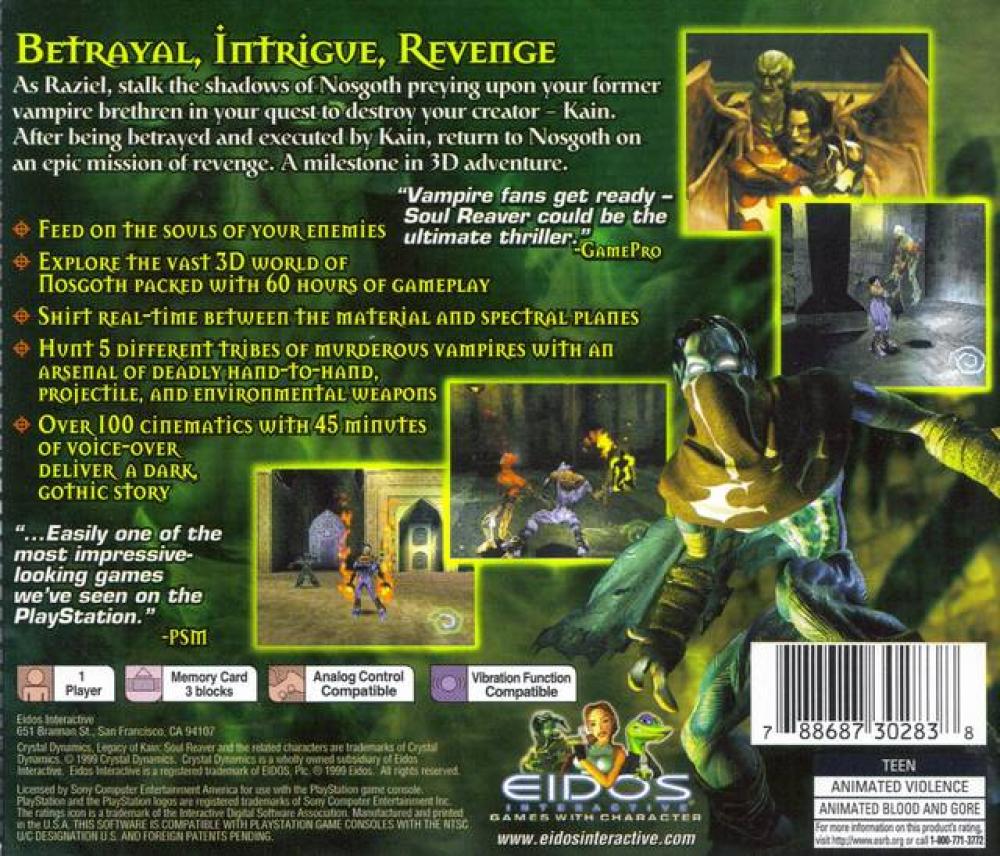 As Raziel, stalk the shadows of Nosgoth preying upon your former vampire brethren in your quest to destroy your creator- Kain. After being betrayed and executed by Kain, return to Nosgoth on an epic mission of revenge. A milestone in 3D adventure.
