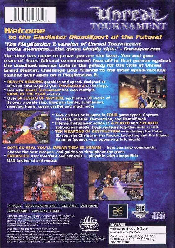 From the creators of Unreal comes Unreal Tournament, a competition that tests your reflexes and competitive spirit in deadly arenas. Battle 15 of your friends or customizable bots in over 30 different levels, such as pirate ships, waterfronts, speeding trains, and floating castles. Multiplayer modes include Capture the Flag, Assault, Domination, and new Deathmatch variations. With enhanced weapons--including the Impact hammer, which squashes your opponent to mush, and the Redeemer, a rocket-powered nuke--expect the body count to be high.
