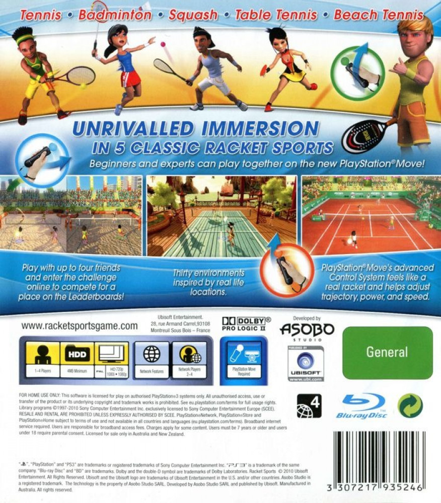 Racquet Sports engages players in 40 rich graphical environments in worldwide locations including an underwater reef, a Moroccan palace, a New York loft, and a fan-filled stadium. The multiplayer feature in Racquet Sports allows the entire family to play cooperatively with each other or to compete against each other at the same time. In addition, users will have the ability to customize their character's body and clothing with different looks and accessories.