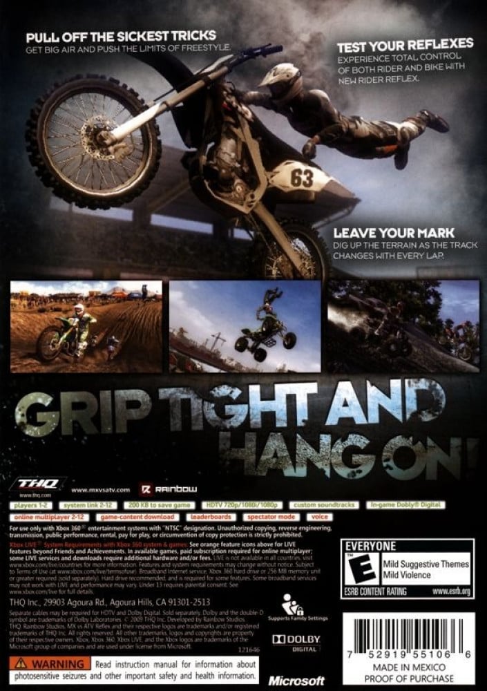 MX vs. ATV Reflex marks the highly anticipated return of the best-selling off-road racing franchise and features the all-new Rhythm Racing 2.0 physics engine, Rider Reflex control system and real-time terrain deformation. The Rider Reflex control system provides unparalleled precision and fluidity by separating machine steering from body positioning, which allows the independently controlled rider to shift his weight, perform death-defying stunts and avoid potentially devastating wrecks. Unprecedented terrain deformation creates ever-changing courses as off-road vehicles carve lines and deep ruts that have a real-time impact on gameplay and remain persistent through the full length of each race.