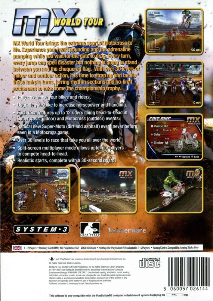 Join Jamie Little--a motocross racer and commentator--in MX World Tour, which features more than 30 levels of both indoor and outdoor racing. Customize your bikes and riders, and then race against up to 12 riders on a variety of tracks located in different parts of the world. You can progress through the game's 30 levels in single-player mode or take on your friends in split-screen multiplayer mode.