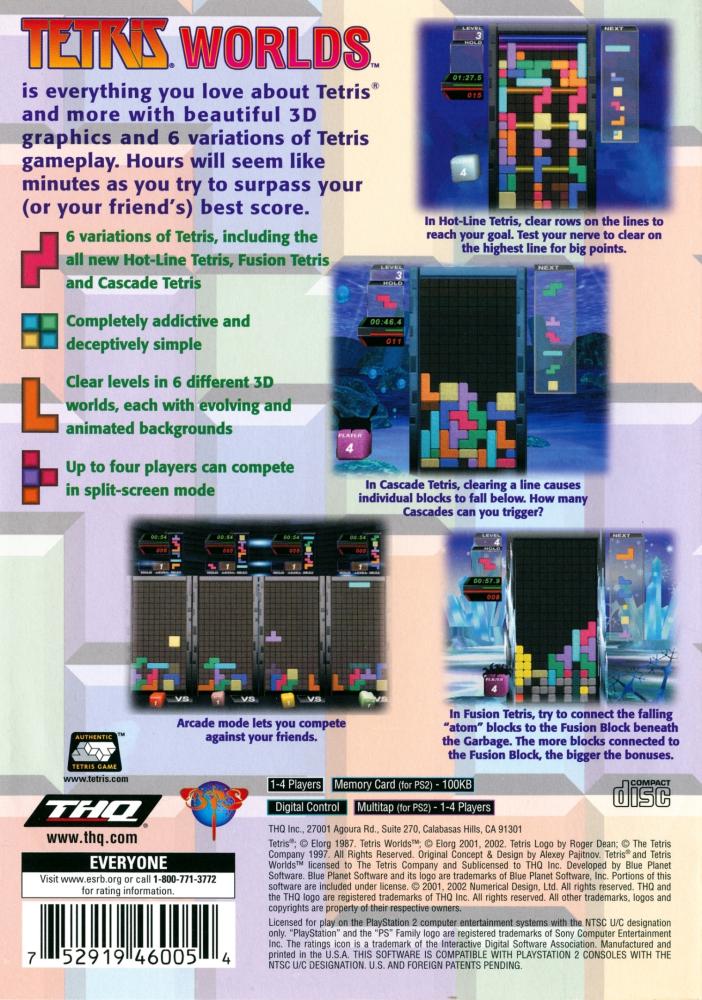 For over a decade, the Tetris series has made an appearance on every game system. Tetris Worlds continues that streak, bringing their distinct brand of simple, yet addictive gameplay to the current generation of systems. Small shapes called Tetraminoes fall from the top of the screen to the bottom and you must rotate them and fit them together to complete lines. The game features six different variations of the classic Tetris, multiplayer mode for up to four players, and six different worlds. Sound easy? Once you start, you can't stop.