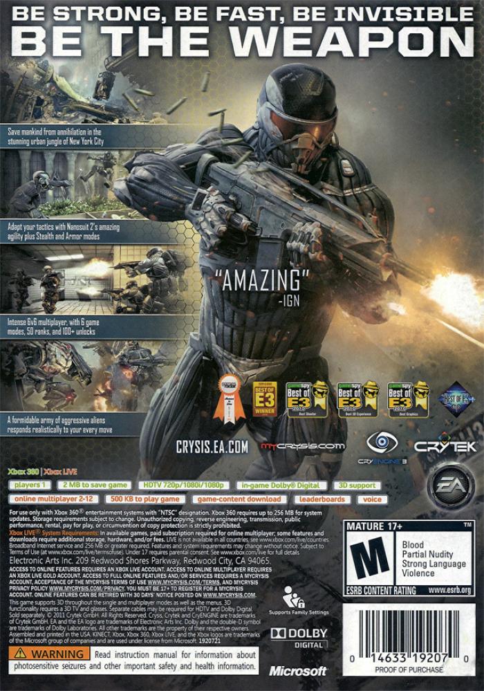The world has been ravaged by a series of climatic disasters and society is on the verge of total breakdown. Now the aliens have returned, with a full invasion force bent on nothing less than the total annihilation of mankind, starting by trying to rip the heart out of Earth's most iconic city. In New York, terrifying alien invaders stalk the streets and a nightmare plague strikes down the city's myriad inhabitants with brutal epidemic speed. The city's systems are in chaos, its streets and skyline are smashed and in flaming ruin. This is New York City like you've never seen it before. Neither paramilitary law enforcement nor the might of the US military machine can stand against the invaders, and all who choose not to flee are dead men walking. Just to survive in this maelstrom of death will require technology beyond anything any modern soldier has ever seen. One man will inherit that means to survive. One supersoldier, wielding the combat enhancement technology of the future with Nanosuit 2, will make the last stand to save humanity from destruction in the urban jungle that is New York City.
