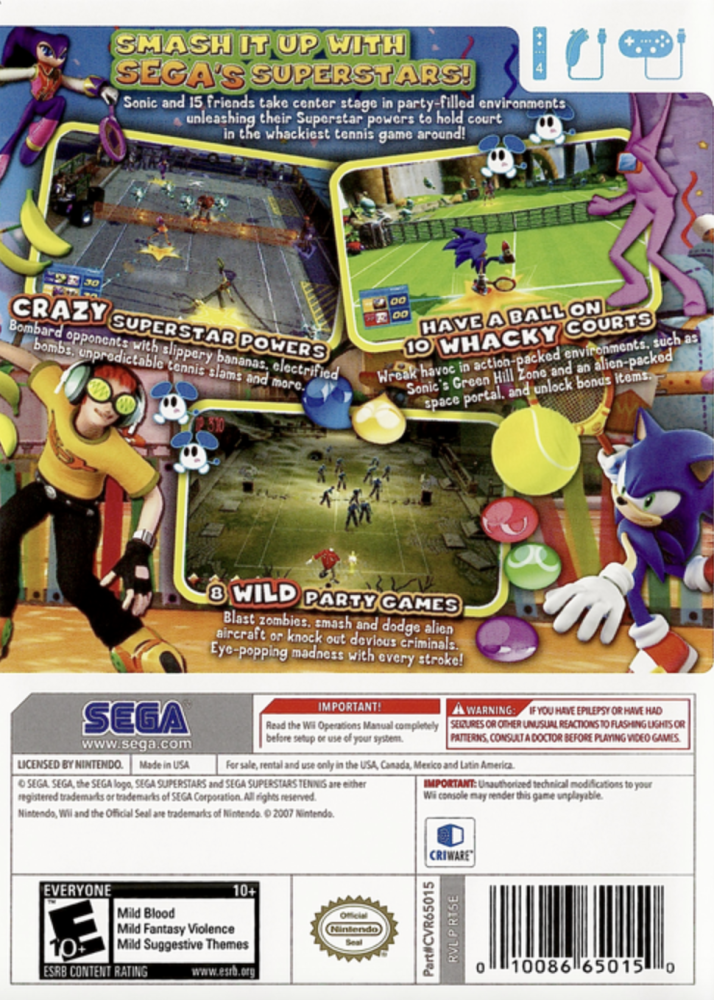 SEGA Superstars Tennis includes over 15 playable SEGA characters - like Sonic The Hedgehog, AiAi from Super Monkey Ball fame, Ulala of Space Channel 5 and Amigo from Samba De Amigo, each of whom have their own unique attributes, and superstar tennis skills. The game's arcade style matches are played out on courts based on environments from Sega games of the past such as the lush tropics of Sonic's Green Hill Zone or the street fair fiesta of Amigo's Carnival Park to name a few.