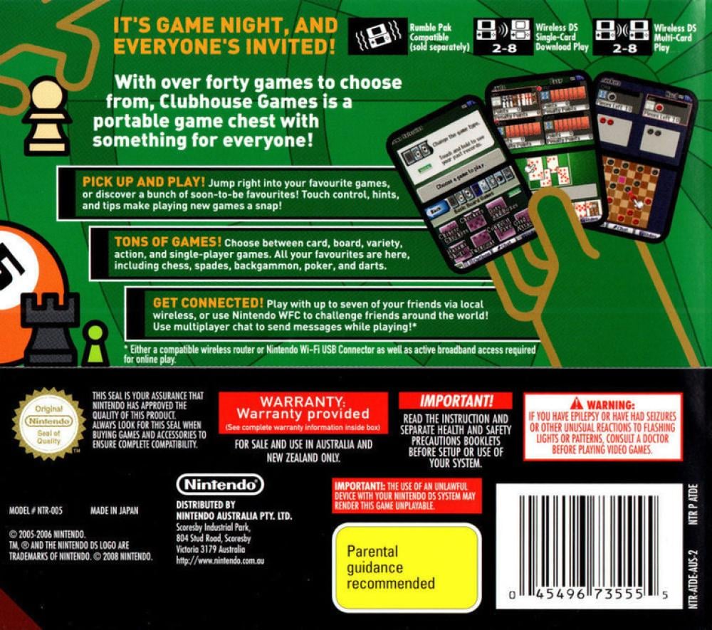 It's game night and everyone's invited. Play more than 20 classic board, card and party games alone, with friends or via Nintendo Wi-Fi Connection. With familiar favorites like checkers, darts and poker, Clubhouse Games is for everyone and part of the Touch Generations library. Video game newcomers will appreciate the easy-to-use interface. Players can challenge up to seven friends with one game card via Multi-Card Play or DS Download Play. Can't play checkers without shouting "KING ME!" across the table? The in-game (PictoChat-like) feature takes table talk to a new level. There's no need to lug around cards or boards when you want to play a quick game. Clubhouse Games is one-stop gaming that will appeal to everyone's tastes, whether they're in the mood for bowling, backgammon, bridge or billiards.