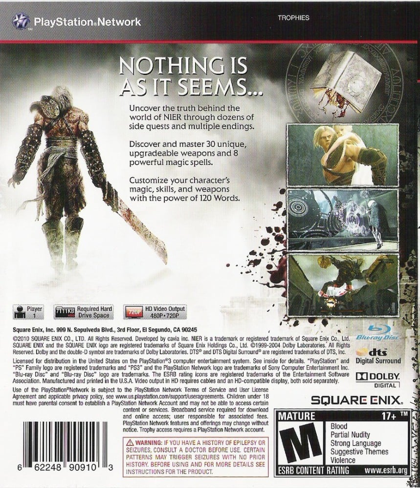 Players will jump into the title role of the unyielding Nier as he begins his desperate quest to discover a cure for his daughter, Yonah, who is stricken with the deadly Black Scrawl disease. Armed with a powerful set of magical abilities as well as mighty swords and armor, Nier will do battle alongside a set of formidable allies against waves of dark enemies and giant bosses to discover the truth about the disease, his daughter...and himself.