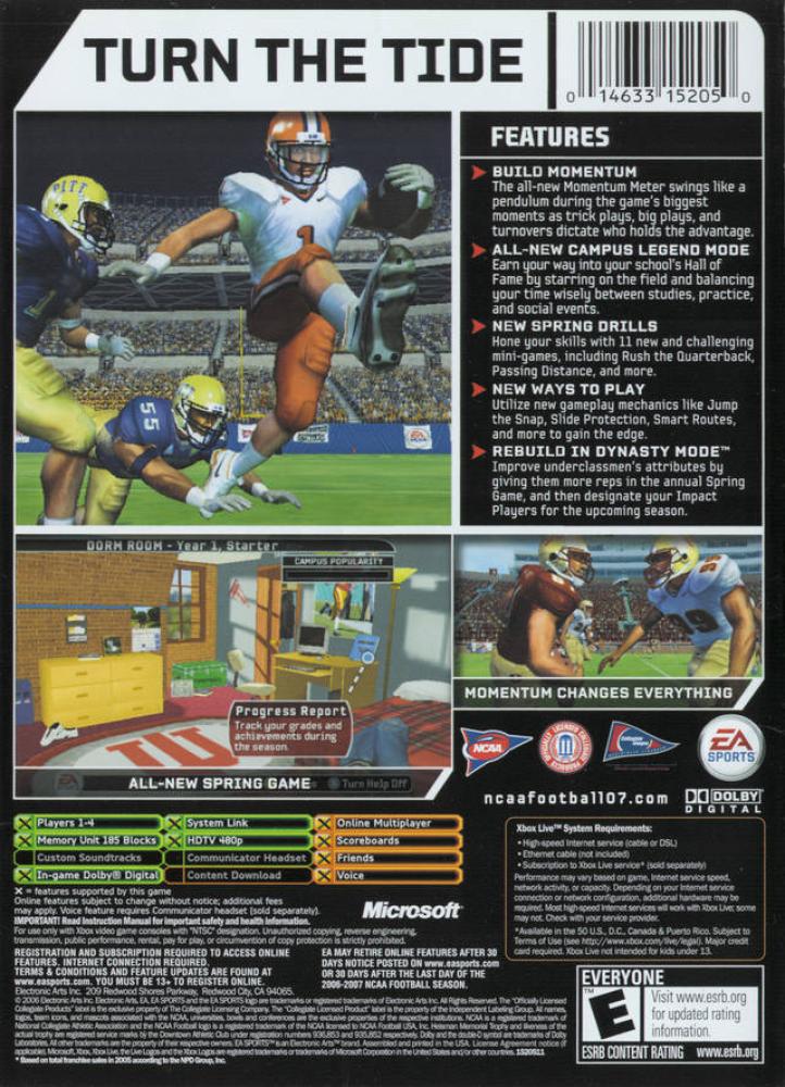 Momentum changes everything - now college football's most celebrated videogame turns the tide with NCAA Football 07. Whether battling your biggest rival or playing for the first-ever BCS National Championship Game in Dynasty Mode, success on the field depends on your ability to maintain momentum. Featuring unprecedented graphics that capture every moment in complete detail--from the authenticity of the stadiums, mascots, and marching bands, to the true-to-life look and feel of the players on the field.