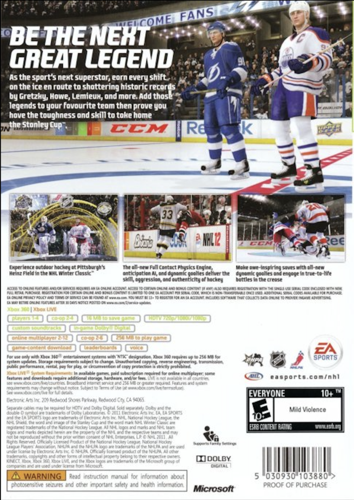 As the sport's next superstar, earn every shift on the ice with stellar play, big hits, and spectacular goals and prove you have the toughness and skill to lead your team to the Stanley Cup. Be the next legend in hockey with NHL 12.