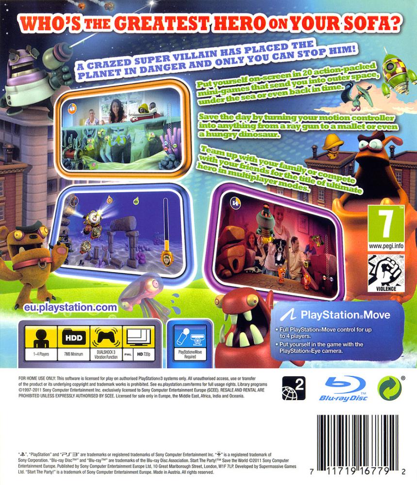 Your PlayStationMove motion controller is about to turn into some of the craziest gadgets imaginable in Start the Party! Save the World on the PlayStation3 system. From the depths of the ocean to skyscraper rooftops, Dr. Terrible is wreaking havoc - pick up your motion controller and battle with this devious enemy.