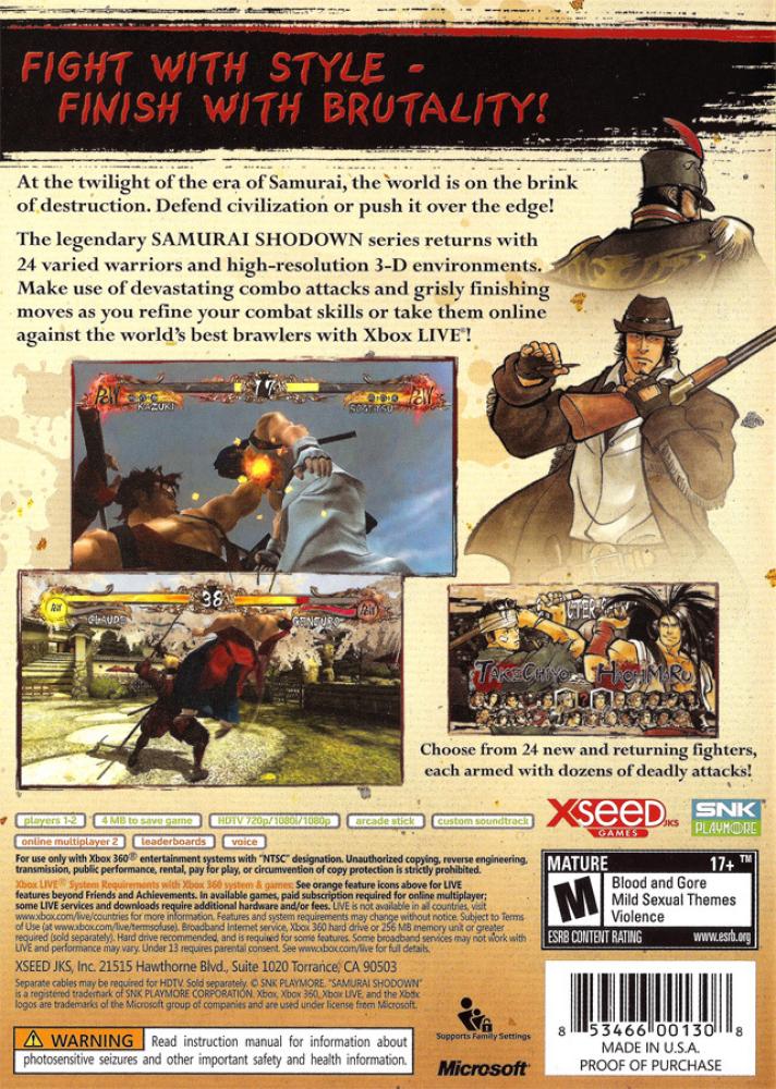 In the midst of chaos and upheaval, the Lord of Amori-han bravely chooses to raise an orphaned European princess as his own daughter. This brave young girl, Suzuhime, matures to become a warrior representing both East and West. Familiar faces from past Samurai Shodown games (including Haohmaru, Nakoruru, and Ukyo) battle alongside newcomers from all corners of the Earth to put an end to the new threat, Golba, and his villainous designs taking root in Japan. Victory on this crucial conflict comes by any means necessary -- even if it means ending a melee with grisly dismemberment or decapitations!