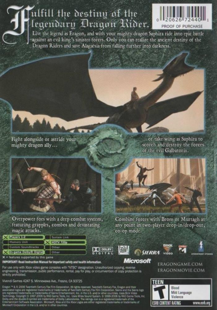 Play as Eragon and his dragon as they set out to fulfill their destiny. Endure perilous travels, adventure and heart-pounding combat as you live the epic events of the movie. Disable and dispatch enemies with the unparalleled skills of a true Dragon Ride. Eragon's combat system features a variety of blistering attacks and defences, including a unique degradable block system. Extensive Dragon Combat - Ride Saphira and blast your enemies with bursts of fire, and call in devastating dragon attacks during melee battles. Eragon features multiplayer co-op with team attack bonuses and dragon fight/flight combo gameplay. Full cooperation from the film production team provides faithful implementation of the movie's look-and-feel. As Eragon discovers the powers hidden within him he learns to unleash magical attacks to decimate his foes.