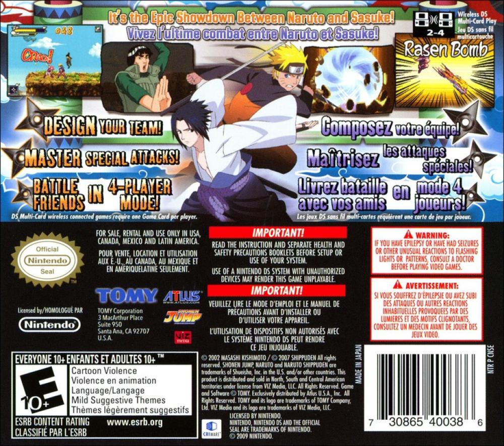 Experience first-hand one of the most popular storylines from the NARUTO SHIPPUDEN arc as Naruto and Sasuke face off amidst a backdrop laced with intrigue and subterfuge! Discover, recruit, and swap fighters into your team to meet the needs of any given situation. Compete against your friends in Wireless Battle Mode for up to four players, or play cooperatively in the new Boss Rush Mode (local wireless only). Take part in thrilling battles and exciting mysteries, all leading up to the epic showdown between Naruto and Sasuke!