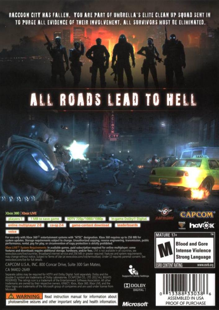 Resident Evil: Operation Raccoon City delivers a true third person team based shooter experience set within the dark and sinister Resident Evil universe. Not only does this setting provide a rich backdrop to the action but it fosters a unique and thrilling triple-threat battle scenario for the game modes. Zombies and Bio-Organic Weapons (B.O.W's) add to the mix as players compete against their team's opposing squad but also tackle this third unpredictable element that could only exist in the twisted Resident Evil universe. The result is a brand new style of gameplay that breaks the conventions of traditional third person shooters. It is September 1998 and the action focuses on the ill-fated Raccoon City and the horrific consequences of the deadly T-virus outbreak. With a cover