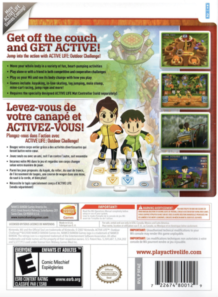ACTIVE LIFE: Outdoor Challenge introduces the Active Life mat, a durable peripheral that lets players control the on-screen action with their hands and feet when used in conjunction with a Wii Remote. The Active Life mat supports and encourages vigorous activities such as running and jumping, allowing for an energizing game experience. From kayaking to mine cart adventures and obstacle-filled races, players will be able to use a variety of hand gestures and foot movements across the Active Life mat’s eight sensor inputs to control each event. Many of the game’s events can be enjoyed in head-to-head or cooperative multiplayer modes with a single mat, letting players enjoy the rush of competition or the gratification of teamwork as they play together.