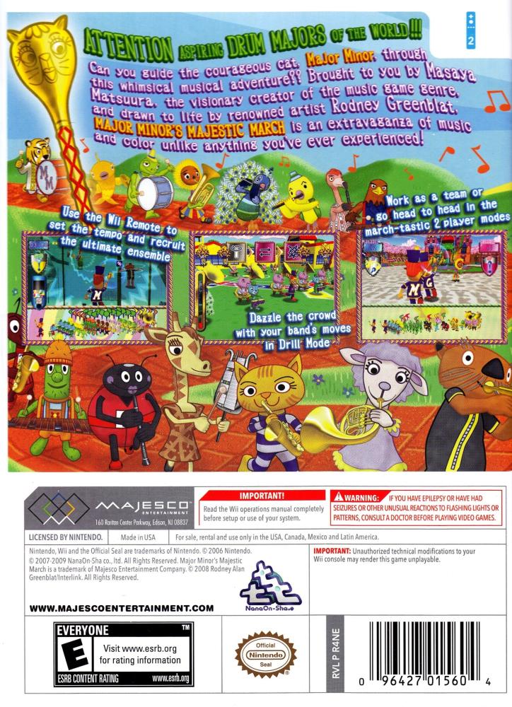 Major Minor's Majestic March turns the Wii Remote into a "special" baton that the bandleader, Major Minor, uses to keep tempo, recruit new band members and pick up valuable items. While marching through eight whimsical locations that contain various hair-raising events, Major Minor strives to create the most impressive parade ever. Players can add up to 15 different instruments to their dynamic procession-including brass, woodwinds, and percussion-to alter its composition and resulting performance.