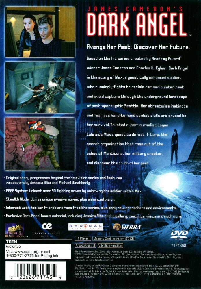 Based on the hit series created by Academy Award® winner James Cameron and Charles H. Eglee. Dark Angel is the story of max, a genetically enhanced soldier, who cunningly fights to reclaim her manipulated past and avoid capture through the underground landscape of post-apocalyptic Seattle. Her streetwise instincts and fearless hand-to-hand combat skills are crucial to her survival. Trusted cyber-jounalist Logan Cale aids Max's quest to defeat -|- Corp, the secret organization that rose out of the ashes of Manticore, her military creator, and discover the truth of her past.
