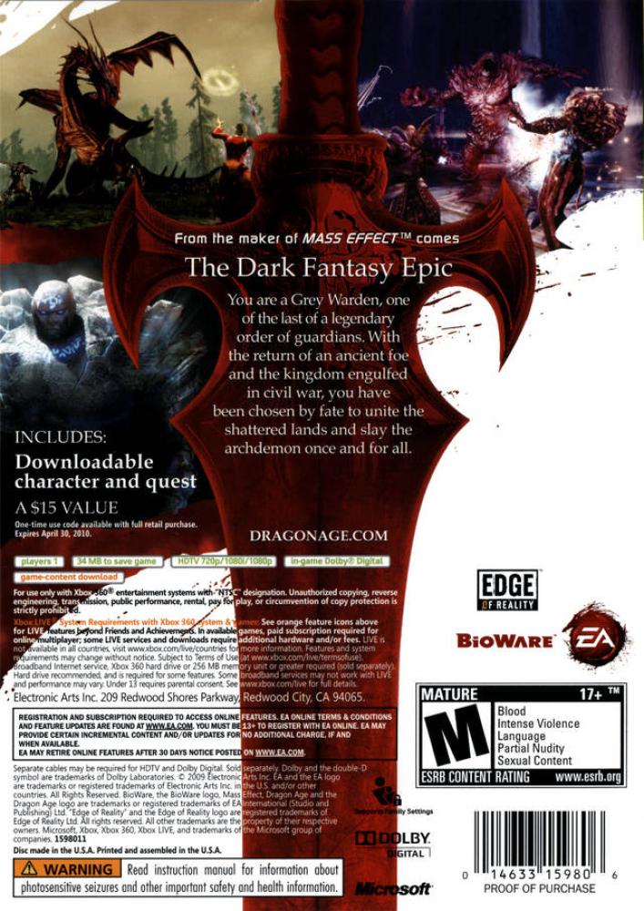 From the makers of Mass Effect, Star Wars: Knights of the Old Republic, and Baldur's Gate comes Dragon Age: Origins, an epic tale of violence, lust, and betrayal.