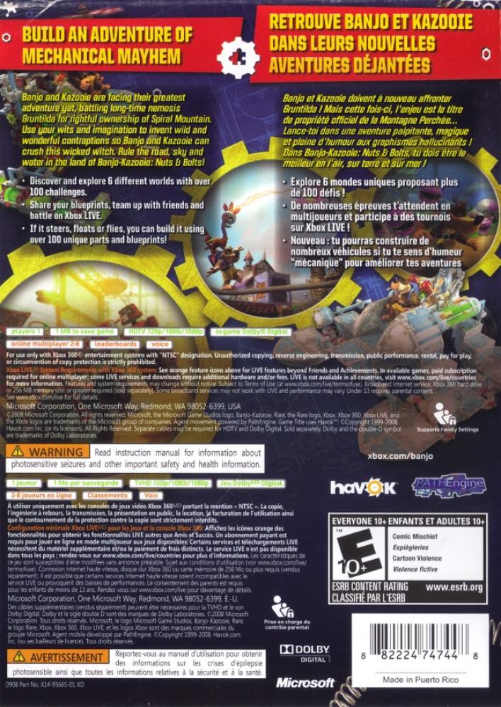 Banjo-Kazooie: Nuts & Bolts embraces new and old fans alike, as the famous bear and bird duo return in high definition for a unique adventure of epic proportions. The Lord of the Games (aka LOG) is tired of the petty squabbling between Banjo and the evil witch Gruntilda (aka Grunty) over the years, and has arranged a showdown to decide the rightful owner of Spiral Mountain. Claiming to have created every video game ever made, LOG has built the game worlds in which the contest's challenges take place. Banjo must complete LOG's challenges to win, while Grunty tries to stop him using every method her devious mind can muster. Throughout their adventure, players create their own abilities by building vehicles for Banjo to pilot over land, water and air. Vehicle parts, which range from simple devices such as engines and wheels to more unusual equipment such as springs and egg guns, are earned and collected throughout the game. Players use their imagination to combine parts in any order to create whatever vehicle they choose. LOG's challenges have one goal, but players' choice of vehicle and tactics determine how they get there. By exploring worlds and solving puzzles, players both young and old are rewarded with more advanced and diverse vehicle parts in their quest to defeat Grunty once and for all. You can play through the adventure alone in the single-player campaign, or play with friends in competitive or cooperative challenges on your own or in teams.
