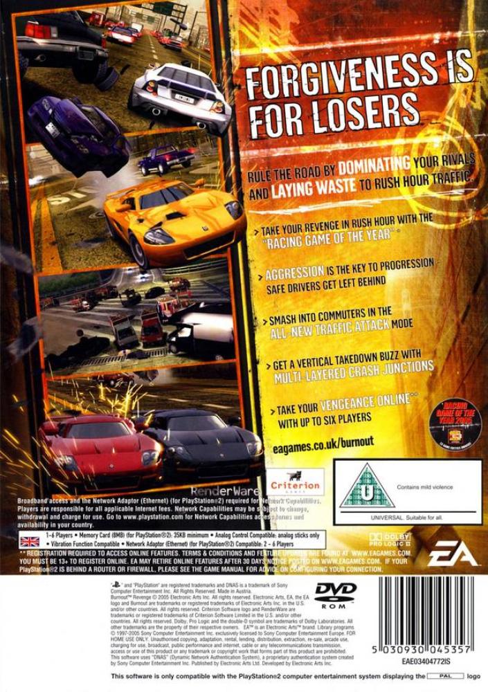 Burnout Revenge is a racing game in which your desire for destruction is as important as your ability to reach the finish line. The sequel to Burnout 3 adds some new features such as detailed car damage, crash combos, and a meter that rewards vengeance on the road. Game modes run the range from pure racing to pure destruction on a handful of real-world locations, including Detroit and Rome. Burnout Revenge also supports online play for challenging other players.