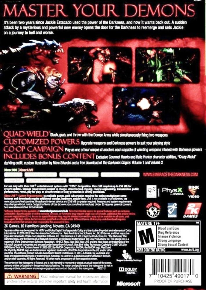 It's been two years since Jackie Estacado used The Darkness to kill the men responsible for his girlfriend's murder. He's been unable to shake the memory of Jenny's death since bottling up his supernatural power and now The Darkness wants out. A sudden, unprovoked attack on Jackie's life heralds the start of a full-scale mob war which has clearly been orchestrated by some outside force. The botched attempt opens the door for The Darkness to reemerge, and sets Jackie on a journey to hell and worse as he unravels the mystery behind the attack and the motivations of The Darkness itself.