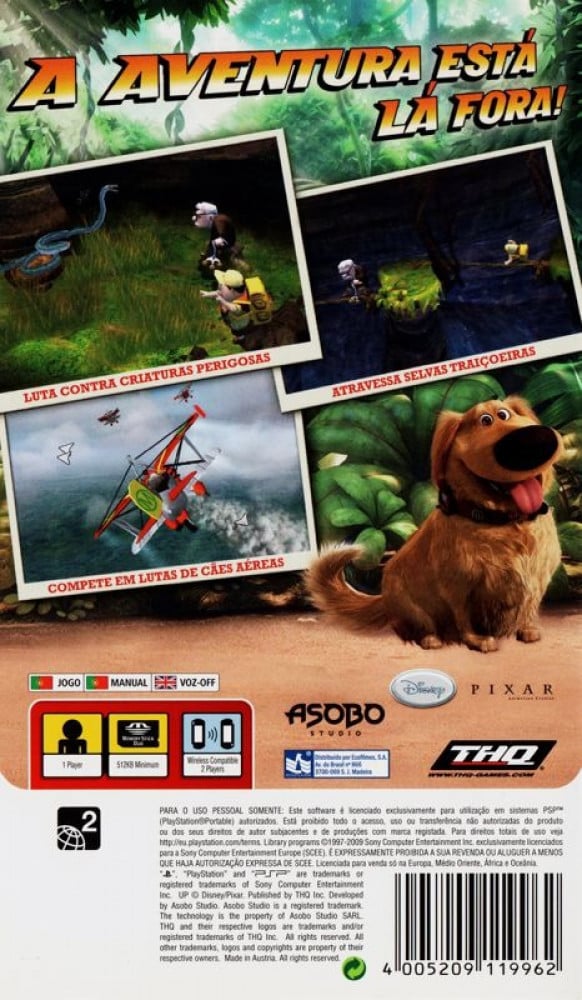 The UP video game takes players on an exotic adventure with Carl Fredricksen and his young sidekick, Wilderness Explorer Russell, as they set off on a wild journey through the undiscovered jungles of South America. Players experience all four main characters from the movie - Carl, Russell, Dug the lovable dog or Kevin the prehistoric bird - while playing as a single-player or with a friend cooperatively throughout the entire game. Players encounter exciting, new environments as they navigate through treacherous jungle terrains, battle dangerous creatures and trek the slippery slopes of the Amazonian Tepuis. In addition, the game also features multi-player game modes, including an epic level that will allow up to four players to compete in aerial combat.