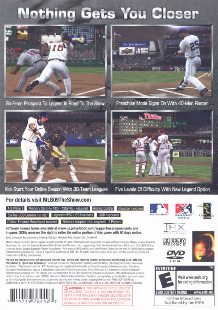 Road to the Show 3.0. Now includes interactive training, new settings, a new steal/lead-off system, presentations and coach interactions. Interactive training will consist of a set of mini-games designed to improve a player's ability and performance in various areas of baseball. Franchise Mode 2.0. Improvements include the long awaited 40-man roster! The latest Franchise Mode improvements will also offer Salary Arbitration, Waiver Transactions and September call-ups. Training/Practice Drills. In MLB 09 users will have the ability to choose from a number of different Training/Practice drills. The drills will be of various concentrations of the game. These drills are a perfect way to polish and improve your baseball skills in The Show. Details & Subtleties. Details and subtleties play a huge role in legitimizing a game and helping you lose yourself in the suspension of disbelief. MLB 09 The Show sinks it's teeth into the details with realistic stadiums and signage, wear and tear on field, dusk to night lighting transitions, stadium Jumbotron animations and even crowd atmosphere-reaching up for foul balls out of play and home runs in addition to crowd rivalries and weather appropriate clothing.